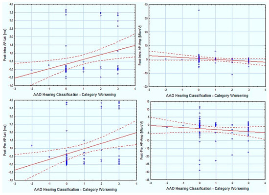 The same statistical correlations found between intraoperative electrophysiological tests and hearing status were evaluated according to AAO—HNS hearing classes. The majority of tests showed significant correlation between hearing worsening expressed as a difference in AAO—HNS hearing classes before and after surgery and the prolongation of Post–intra AP—Lat (R = +0.26), which was analogous to the reduction of the postoperative AP—Amp (R = −0.3). A correlation using the same test also demonstrated dependences of AAO—HNS hearing classes before and after VS resection and prolongation of AP—Lat or reduction of AP—Amp (R = 0.19 and R = −0.24, respectively) (see details in Table 4 and Figure 2).