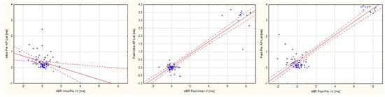 Statistical analyses showed some significant correlations between ABR and TT-ECochG during IM of hearing during VS resection. Spearman’s Test revealed that the prolongation of postop AP—Lat in relation to intraoperative AP—Lat (Post–intra AP—Lat) correlates with the Post–intra ABR I–V (R = +0.4). A similar correlation analysis between Post–pre AP—Lat and Post–pre ABR I–V also revealed significance (R = +0.3). A different tendency was observed upon analysis of the correlation between Intra–pre AP—Lat and Intra–pre ABR I–V (R = −0.27). In the next analysis, Spearman’s test showed correlations between Post–intra AP-Amp and Post–intra ABR I–V (R = −0.37). Some correlations were also observed between the reduction in the amplitude of the action potential after surgery (Post–pre AP—Amp) and Post–pre ABR I–V (R = −0.23). Details are presented in Table 5 and Figure 3.