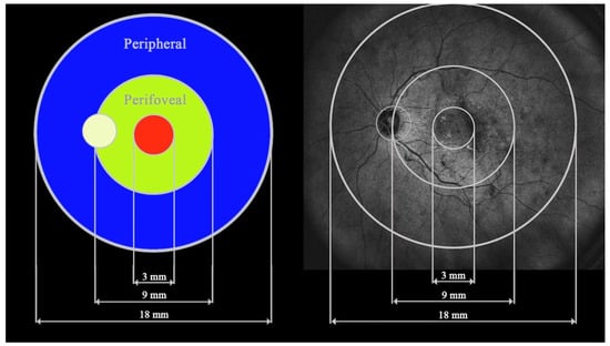 All patients underwent WF-OCT testing performed after pupil dilation with swept-source Xephilio OCT-S1 (Canon Medical Systems Europe B.V., Amstelveen, The Netherlands, 2023), which enables the widest scan of 23 × 20 mm. Measurements are performed in 24 fields. For the purpose of this study, the 24 fields were merged into three zones for easier evaluation and differentiation between far and close periphery: a central circle of 3 mm diameter (central), a ring contained between a centered 9 mm circle and the central 3 mm circle (perifoveal), and a second, more peripheral ring between centered 18 mm and 9 mm circles (peripheral); see Figure 1.