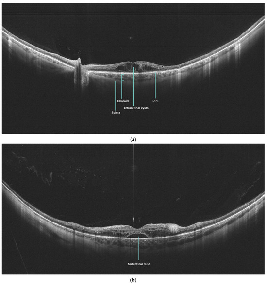 Examples of UWF-OCT scans of patients with DME are presented in Figure 2a,b.