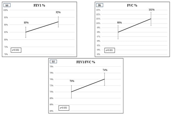 A comparison of respiratory function before and after treatment. (a) FVC% (Forced Vital Capacity expressed in %); (b) FEV1% (Forced Expiratory Volume in the 1st second expressed in %) and (c) FEV1/FVC ratio in %.