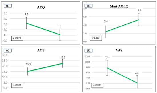 Changes in punctuation of the scales after the treatment. (a) ACQ (Asthma Control Questionnaire); (b) Mini-AQLQ (Asthma Quality of Life Questionnaire); (c) ACT (Asthma Control Test) and (d) VAS (Visual Analogue Scale).
