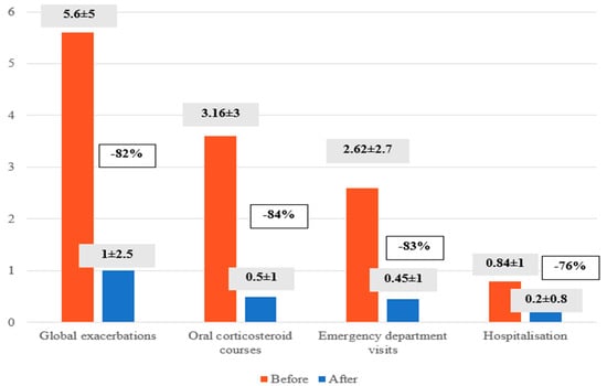In the year prior to the initiation of benralizumab, 33% of patients had been hospitalised, 70% had visited the emergency department, and 72% had received courses of oral glucocorticoids. The mean number of exacerbations per patient per year was 5.6 ± 5. After treatment with benralizumab, exacerbations were reduced by 82% (5.6 ± 5 vs. 1 ± 2.5, p < 0.001), the number of steroid cycles by 84% (3, 16 ± 3 versus 0.5 ± 1, p < 0.001), emergency department visits by 83% (2.62 ± 2.7 versus 0.45 ± 1, p < 0.001) and hospital admissions by 76% (0.84 ± 1 versus 0.2 ± 0.8, p < 0.001) (Figure 4).