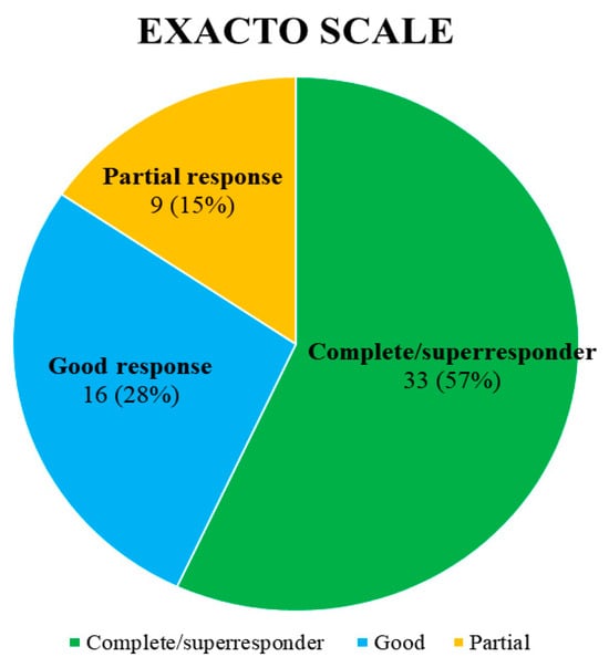 The mean FEOS score after treatment was 73 ± 14. According to the multidimensional EXACTO scale, 33 patients (57%) achieved a complete or super-response, 16 (28%) a good response, and 9 (15%) a partial response (Figure 5).