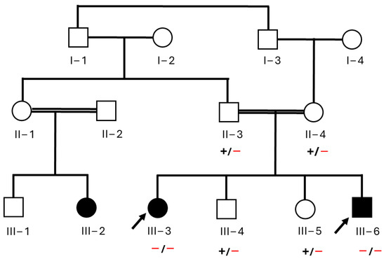 Genomic DNA was isolated from blood samples using the DNeasy Blood & Tissue Kit (Qiagen cat no. 69504) following the manufacturer’s instructions. DNA purity was assessed through 1.5% of agarose gel electrophoresis. DNA concentration was measured using a nanodrop spectrophotometer. DNA from both affected individuals including a female (III-3) and a male (III-6) was subjected to exome sequencing using the Illumina NovaSeq6000 according to a previously described protocol [18,19]. The xGen Exome Research Panel v2 kit (Integrated DNA Technologies cat no. 10005151) was used for DNA library preparation. The analysis of raw reads was performed using the Burrows–Wheeler Aligner (BWA) software (Version 0.7.17). The Illumina BaseSpace analysis tool was used for variant calling and filtration. The called variants were annotated using ANNOVAR software [https://annovar.openbioinformatics.org/en/latest/; accessed on 5 March 2024].