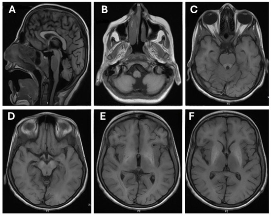 Brain magnetic resonance imaging (MRI) of patient (III-3). (A) Cerebellar atrophy flair saggital sequence flair; (B) hypoplasia of vermis axial T1; (C) increased signal from the basal ganglia down to the brain stem mainly midbrain (cerebri) and pones (ventral). Ventrical pons around 4th ventricle; (D) midbrain (cerebri bilateral); (E) frontal bilateral white matter hypersignal; (F) continuation of hypersignal to basal ganglia signs of hypomyelination.