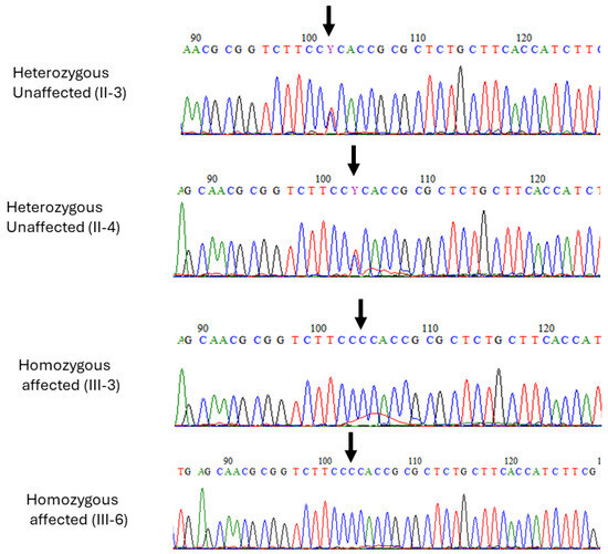 Bidirectional Sanger sequencing was conducted to analyze all potential variants detected in the samples of affected individuals (III-3 and III-6) and across all family members according to the earlier established protocol [18,20]. Specific primers were designed for each candidate variant using Primer3 software (version 0.4.0). A reference DNA sequence of candidate genes was obtained from the Ensembl genome browser [https://www.ensembl.org; accessed on 6 April 2024]. The Sanger sequence data were aligned with the target reference sequence using BIOEDIT software (version 6.0.7) to validate the identified variants.
