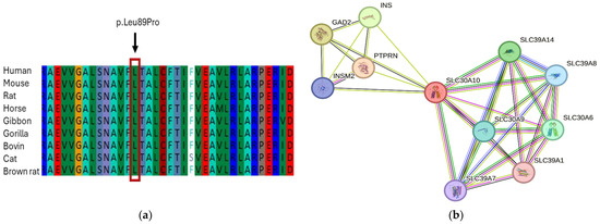 In silico analysis of SLC30A10. (a) SLC30A10 protein domain showing p. Leu89Pro is highly conserved in all vertebrate species from human to brown rat; (b) the protein network analysis of SLC30A10 was performed using the STRING software (Version 12). The PPI analysis showed strong interaction of SLC30A10 protein with other solute carrier family proteins as well as other vital proteins such as PTPRN, INSM2, INS, and GAD2.