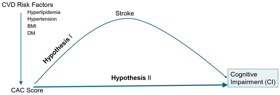 CAC score and cognition. Models for potential association between CAC score and cognitive impairment (CI). Hypothesis I: Potential mediation effects of stroke for the association between CAC score and CI. Hypothesis II: CAC score is independently associated with CI. BMI = body mass index, DM = diabetes mellitus, CAC score = coronary artery calcification score, and CVD = cardiovascular disease.