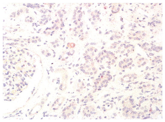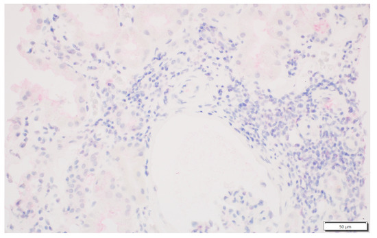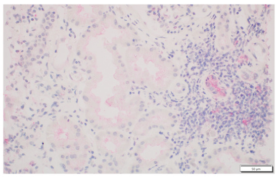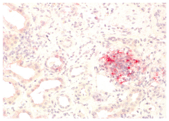 We analysed the expression of IDO1 in interstitial foci. The scoring system for IDO1 expression in interstitial foci was maintained on a binary scale, with ‘0’ indicating no IDO1 presence and ‘1’ indicating any presence of IDO1. This binary approach was adopted to assess the potential association of IDO1 presence in interstitial foci with graft rejection. Immunohistochemistry analyses were performed on tissue sections using primary 1F8.2 antibodies against IDO1 (Sigma-Aldrich, Burlington, MA, USA) [18]. The epitope retrieval and staining procedures, including EnVision Target Retrieval Solution (Agilent Technologies, Inc., Santa Clara, CA, USA) and the Autostainer Link 48 (Agilent Technologies, Inc., Santa Clara, CA, USA), were consistent with the earlier study [19,20,21]. It also applies to the detection system, Liquid Permanent Red (Agilent Technologies, Inc., Santa Clara, CA, USA) [22]. The system divided the division into two groups for research: the IDO1-IF(+) positive and the IDO1-IF(−) negative groups. This facilitated a comparative analysis between these groups regarding rejection in transplanted kidneys, causes of chronic renal failure, post-transplantation treatment and a comparison of patient characteristics within each group. The distinction between interstitial immune cells and tubular epithelium, which we focused on in our previous study, was based on detailed histopathologic analyses performed by experienced renal pathologists (PD and AH) [21]. Tubules are structures with lumen, and interstitial immune cells are dispersed and do not form tubular structures. To better showcase the process, Figure 1 shows no IDO1 expression in interstitial foci, and Figure 2 displays IDO1 activity in tubular epithelium in comparison, while Figure 3 and Figure 4 show IDO1 immunoreactivity in interstitial foci.
