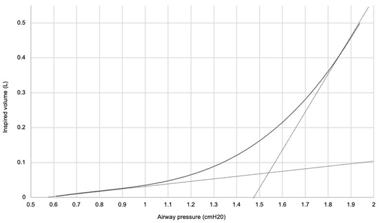 Following the use of the research device, data was imported and synchronized in an Excel macro. The inspired volume during each inflation was calculated, and a pressure–volume curve was generated. Lines indicating minimal and maximal compliance were added. The pressure at which these lines intersected was calculated, indicating the LIP (Figure 2).