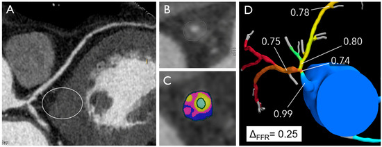The EMERALD study proposed that integrating four specific non-invasive hemodynamic parameters derived from CCTA could potentially enhance the prediction of ACS risk, thus allowing for the development of optimized treatment strategies for individuals at heightened risk. The following parameters were identified as potential predictors of ACS risk: (1) CTFFR (cut-off value of 0.80), (2) change in CTFFR across the lesion (Δ CTFFR, cut-off value of 0.06), (3) wall shear stress (WSS) (cut-off value of 154.7 dyn/cm2), and (4) axial plaque stress (cut-off value of 1606.6 dyn/cm2) [63] (Figure 3, graphical abstract).