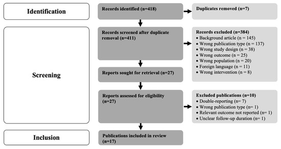 Out of 418 articles initially screened, 27 underwent a thorough review for eligibility. A total of 384 studies were removed for various reasons, and 10 had to be excluded from further analysis after full-text review for eligibility, mainly due to reporting of study data already considered in other publications. Subsequently, 17 studies, collectively comprising data from 1962 patients and covering an average follow-up duration of 17.5 ± 16.9 months, met the inclusion criteria for further analysis (Figure 1). Most of these studies were found to have a low-to-moderate risk of bias (Table 2). Reporting of adverse events (AEs) across the included studies demonstrated notable heterogeneity, both in the utilized classifications or definitions, as well as the extent of reporting. Standardized reporting guidelines for AEs and complications with HNS therapy have not yet been established to the authors’ knowledge.