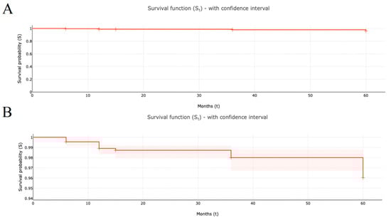 HNS system survival probability over follow-up time of included studies (St with 95% confidence interval): (A) = survival probability scaled from 0.0 to 1.0; (B) = survival probability scaled from 0.94 to 0.99.