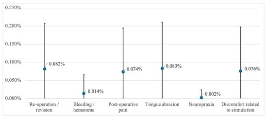 Rates of adverse events and side effects identified from the included studies and the respective 95% confidence intervals are presented in Figure 3. The pooled rate of surgical revision or re-operation was observed to be 0.08% (95% CI = 0.0 to 0.21%). Reasons identified encompassed revisions of hematoma or seroma, scar corrections, or repositioning of device components due to discomfort or technical dysfunction. Bleeding was defined as an event occurring either during surgery or leading to additional surgical measures, and occurred at a weighted average rate of 0.01% (95% CI = 0.00 to 0.07%). Neuropraxia was reported at a weighted average rate of 0.004% (95% CI = 0.00 to 0.02%), while postoperative pain was present at a rate of 0.07% (95% CI = 0.00 to 0.19%).
