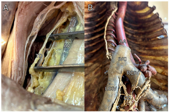Photos of thoracic duct (TD) (A) and cisterna chyli (CC) (B) from the cadaveric dissection. AV—Azygos Vein. AA—Abdominal Aorta. IVC—Inferior Vena Cava. RCIV—Right Common Iliac Vein. LCIV—Left Common Iliac Vein.