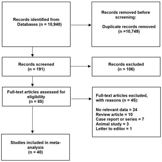 The database search and the manual search identified a total of 10,940 studies that were initially evaluated by two independent reviewers. After removing duplicates and irrelevant records, a total of 191 articles were qualified for a full-text evaluation. To minimize potential bias and maintain accurate statistical methodology, articles such as case reports, case series, conference reports, reviews, letters to editors, and studies that provided incomplete or irrelevant data were excluded. The inclusion criteria consisted of original studies with extractable numerical data regarding the topic of this study. Studies written in languages other than English were also evaluated but only included in case of high certainty of maintaining the meaning of the extracted data. Finally, a total of 41 studies were included in this meta-analysis. Additionally, the AQUA Tool, which was specifically designed for anatomical meta-analyses, was used to minimize the potential bias of included studies [9,10].