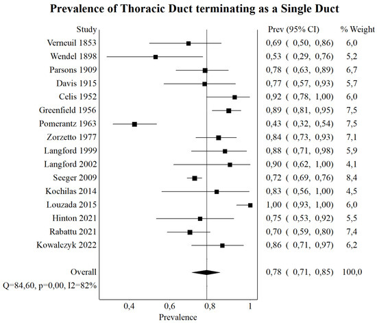 Forrest plot—analysis of the prevalence of thoracic duct terminating as a single duct [13,14,15,19,21,22,23,28,31,33,34,38,40,42,46,47].