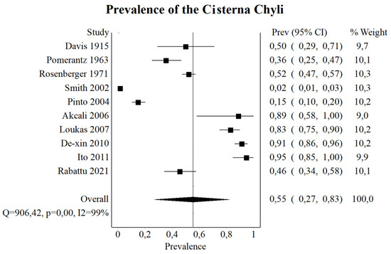 Forrest plot—analysis of the prevalence of cisterna chyli [2,29,32,33,34,35,39,45,47,49].