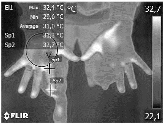 Thermal imaging of the specified hot points was performed using the advanced FLIR E8-XT thermography system (FLIR Systems Inc., Wilsonville, OR, USA) (Figure 2) [61]. This procedure entailed obtaining two accurate measures of the dorsal (back) and palmar (front) aspects of the hand, following methodologies from previous research [61]. The FLIR E8-XT system offered an automated and precise evaluation of thermal anomalies, facilitating the detection of subtle variations in skin temperature that were indicative of underlying physiological processes.