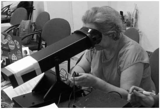 Cortical arousal was measured using the Critical Flicker Fusion Threshold (CFFT) technique, performed in a controlled viewing chamber using the Lafayette Instrument Flicker Fusion Control Unit Model 12,021 (Lafayette Instrument Company, Lafayette, IN, USA) (Figure 3). This method complied with previously established guidelines [62,63], guaranteeing methodological uniformity and accuracy. The CFFT technique entails identifying the highest frequency at which a person perceives a flickering light as continuous, reflecting the brain’s processing speed and overall cortical arousal.