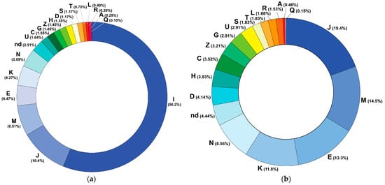 (a) The ICD structure of primary diagnoses (n = 1030). (b) ICD categories of morbidities other than circulatory system diseases (I). Only the first letters of ICD categories are provided. Note: J—diseases of the respiratory system; M—diseases of the musculoskeletal system and connective tissue; E—endocrine, nutritional, and metabolic diseases; K—diseases of the digestive system; N—diseases of the genitourinary system; ‘nd’—not defined; D—diseases of the blood and blood-forming organs and certain disorders involving the immune mechanism; H—diseases of the eye and adnexa and diseases of the ear and mastoid process; C—neoplasms; Z—factors influencing health status and contact with health services; G—diseases of the nervous system; I—diseases of the circulatory system; U—codes for special purposes; S and T—injury, poisoning, and certain other consequences of external causes; L—diseases of the skin and subcutaneous tissue; R—symptoms, signs, and abnormal clinical and laboratory findings not elsewhere classified; A—intestinal infectious diseases; Q—congenital malformations, deformations, and chromosomal abnormalities.