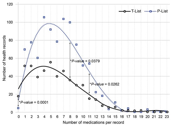 Figure 4 shows a distribution of patients depending on the number of taken and prescribed medications recorded in their EHRs. The number of records with zero medications in the P-List was significantly lower than in the T-List (p-value = 0.0001), while the groups of patients prescribed with 8 or 11 medications were relatively larger than the corresponding groups of patients taking the same numbers of medications (p-value = 0.0379 and p-value = 0.0262, respectively).