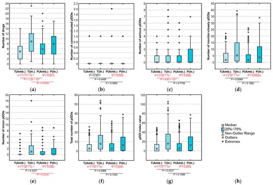 Median numbers of drugs (a), contraindicated pDDIs (b), serious pDDIs (c), monitor-closely pDDIs (d), minor pDDIs (e), total pDDIs (f), and pDDI index values (g) in the lists of taken and prescribed medications based on ambulatory and in-hospital electronic health records in cardiovascular patients. Subfigure (h) is the key explaining symbols used in the images (a–g). Note: T(Amb.)—the T-List derived from ambulatory records, T(In.)—the T-List derived from in-hospital records (discharge epicrises), P(Amb.)—the P-List derived from ambulatory records, P(In.)—the P-List derived from in-hospital records (discharge epicrises).