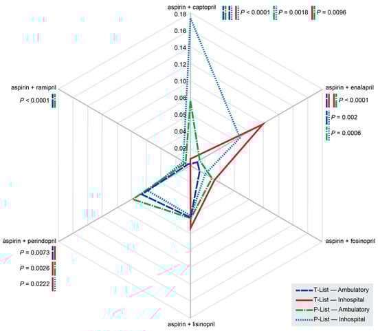 Interestingly, the structure of ‘aspirin + ACE inhibitor’ combinations in our study significantly differed between the T-List and P-List. Significant differences were also observed in the probabilities of various ‘aspirin + ACE inhibitor’ combinations depending on medical encounter type, i.e., ambulatory medical charts versus hospital discharge epicrises. According to manufacturers’ instructions, the clinical impact of pDDIs of ‘aspirin + captopril’ and ‘aspirin + enalapril’ may be insignificant if a daily aspirin dose does not exceed 300 mg. However, the abundance of higher-order pDDIs, the controversial clinical significance of low-dose aspirin administration [31,50,51,52,53,54,55,56,57], and the administration of a wider array of ACE inhibitors, not limited to captopril or enalapril only, provided the rationale for the detailed characterization of ‘aspirin + ACE inhibitor’ combinations.