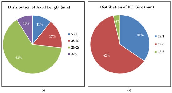 The Visian V4 ICL model was implanted in all eyes. Patients received one of three of the following ICL sizes (mm): 12.1 (34%), 12.6 (62%), and 13.2 (4%) (Figure 1b). Concerning cataract surgery, 17 types of posterior chamber intraocular lens models and lens types were utilized (Table A1). The distribution of ICL and IOL powers used can be found in Table 1.