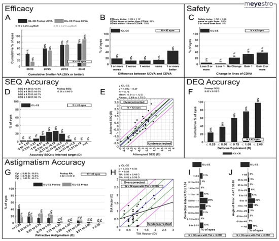 Visual Outcomes six months after CE (n = 44) (A) Post-operative uncorrected distance visual acuity (UDVA) versus pre-operative corrected distance visual acuity (CDVA). (B) Efficacy: change in Snellen lines from pre-operative CDVA to post-operative UDVA. (C) Safety: change in Snellen lines from pre-operative CDVA to post-operative CDVA. (D) Spherical Equivalent (SEQ) Accuracy: accuracy of post-operative spherical equivalent refraction to target. (E) Attempted versus achieved spherical equivalent refraction, with linear regression and correlation values; the black line represents the equation y = x, and the closer the regression line is to the black line, the more accurate the results. (F) Defocus Equivalent (DEQ) Accuracy (G) Change in refractive astigmatism. (H) TIA vs. SIA; Blue Line: target; Between green lines: within ±0.50 D of target; Between pink lines: within ±1.0 D of target. (I) Histogram of correlation Index; (J) Angle of Error. CE = Cataract Extraction, TIA = Target-induced astigmatism, SIA = surgically induced astigmatism, ICL = Implantable collamer lens, D = Diopter.