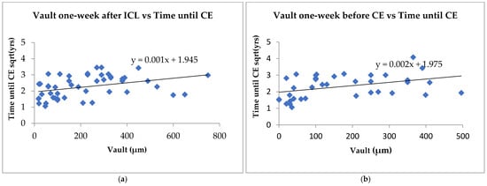 Regression model of the relationship between vault height and time from ICL implantation to cataract extraction (CE). (a) Demonstrates the vault one week after implantable collamer lens (ICL) vs square root of the time until ICL. (n = 48). (b) Regression model of the relationship between late vault and the square root of the time until CE. R2 values = 0.16 (a) and 0.14 (b) (n = 36).