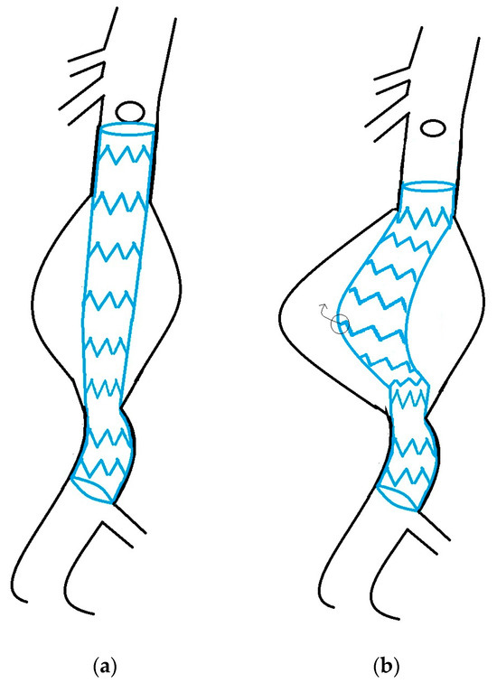 (a) before migration; (b) after Prosthesis migration from any cause (e.g., endoleak Type Ia or Ib) and aneurysm sac expansion can lead to redundancy of the endograft, resulting in unfavorable conformations that increase stress on stents and fabric. The arrow depicts the outward displacement force of the Z-stent against the fabric, creating a force favorable for developing a fabric tear).