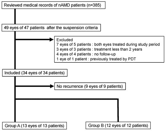 Of the 385 patients whose medical records were examined, there were 34 eyes of 34 patients who met the inclusion criteria. These included 12 women and 22 men, whose median age was 76 years, with a range of 72 to 82 years. A recurrence occurred in 25 of the 34 patients (73.5%) within the 5-year study period (Figure 1), and 13 patients were placed in Group A and 12 patients in Group B (Figure 1).