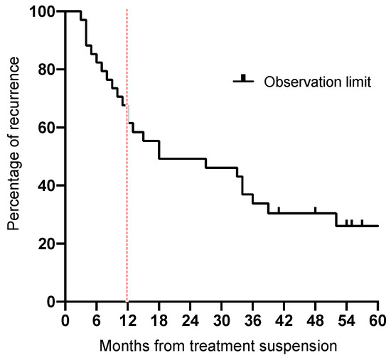 Kaplan–Meier survival plot showing the time and proportion of recurrences that occurred after the treatment suspension.