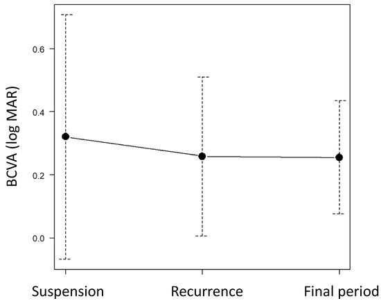 The BCVA after the resumption of treatment in Group A was not significantly different from that at the suspension examination (p = 0.85, baseline) or at the final examination (p = 0.84) (Figure 3).