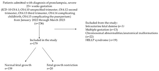 A total of 236 patients at 23 weeks of gestation and above were diagnosed with PECS at our center in the time period specified. After excluding intrauterine fetal demise, multiple gestations, chromosomal abnormalities/genetic malformations, and HELLP syndrome, 179 patients with PECS were identified for inclusion in this study, 20 of whom had concomitant FGR (Figure 1). The baseline characteristics of the cohort are presented in Table 1. Race and ethnicity differed significantly between the two groups. The FGR group had a lower gestational age on admission, a lower BMI, and was more likely to be non-white or non-Hispanic. Parity, tobacco use, gestational age at preeclampsia onset, latency to delivery, mode of delivery, insurance, education level, and medical comorbidities did not differ between the two groups.