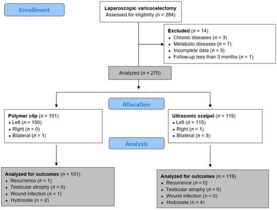 All adolescents who underwent laparoscopic varicocelectomy at the Department of Pediatric Surgery at the University Hospital of Split between 1 May 2019 and 1 May 2024 were included in the analysis. This study was designed as a retrospective trial with a prospective arm. The data of the patients who underwent varicocelectomy with a polymer clip were collected retrospectively, while the data of the patients who underwent varicocelectomy with an ultrasonic scalpel were collected prospectively. During the study period, a total of 284 adolescents who underwent laparoscopic varicocelectomy were identified. However, 14 adolescents were excluded from further analysis because they met one or more exclusion criteria. Finally, 270 adolescents met the inclusion criteria and were analyzed further. Male adolescents aged 13 to 17 years who underwent laparoscopic surgery at our institution for the treatment of symptomatic varicocele using an ultrasonic scalpel or polymer clip and who were followed up for at least three months after surgery were included in the study. Adolescents who underwent open retroperitoneal or inguinal/subinguinal microsurgical varicocelectomy, adolescents with chronic, metabolic, and endocrinologic diseases or systemic infections, and those with incomplete data in the medical records were excluded from the study. A flow chart of the study is shown in Figure 1.