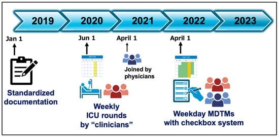 Changes in the EICU round and meeting structure are illustrated in Figure 1, which began with the initiation of standardized documentation by a nurse regarding multidisciplinary rounds or meetings within the electronic medical record on 1 January 2019. This documentation framework included listing the members present, outlining the objectives of the meetings, and providing context based on Jonsen’s four-box model for medical decision-making, when necessary [15]. From 1 June 2020, weekly ICU rounds by clinicians, excluding physicians, were implemented. These rounds initially involved healthcare professionals other than physicians, to allow for a focused assessment on the nursing and supportive-care aspects of patient management. This approach aimed to strengthen the collaboration among these team members, ensuring that all perspectives were integrated into patient care plans. Subsequently, it was determined that the inclusion of physicians would further enhance the multidisciplinary approach with their medical expertise. Therefore, physicians joined these rounds on 1 April 2021. This phased inclusion allowed for a smoother integration of physicians into the established structure, fostering a more cohesive and collaborative environment. In addition, morning MDTMs, utilizing a checkbox system, were initiated on 1 April 2022. These half-hour sessions were designed to briefly discuss the daily goals of care for each patient in the ICU. The multidisciplinary team comprised emergency and critical-care physicians, nurses, pharmacist, a clinical engineer, a nutritionist, a physical therapist, and a medical social worker.