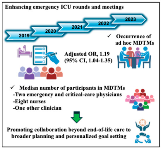 Moreover, the intensified likelihood of MDTMs in the latter phases of our study suggests a refinement over time in recognizing scenarios that benefit from ad hoc discussions. This evolution likely stems from integrating changes into regular ICU meetings, thereby facilitating more comprehensive interdisciplinary exchanges, creating environments for discussing complex cases, and enabling deeper exploration of patient-care goals beyond the daily rounds’ limitations (Figure 2).