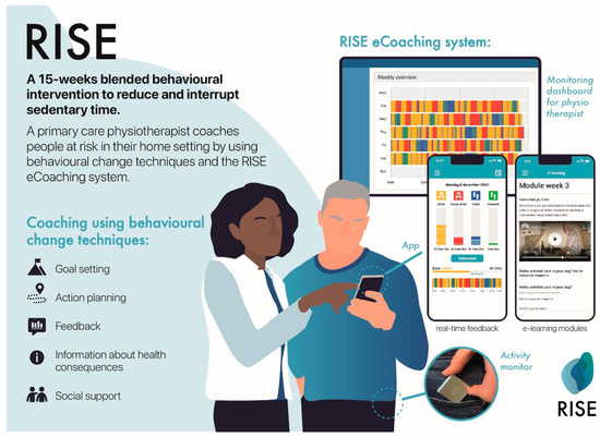 The following behavior-change techniques were at the core of this blended intervention: goal-setting (on behavior and outcome), action planning, social support, self-monitoring on behavior, feedback on behavior, the discrepancy between current behavior and goal, information about health consequences, problem solving, restructuring the social environment, prompts and cues, habits formation, and instructions how to perform the behavior. The RISE eCoaching system used the activ8 activity monitor, a reliable and valid tool to determine movement behavior [42,43]. The intervention was delivered in the participants’ home by four primary care physiotherapists who all received training to provide the RISE intervention. The training included subjects such as healthy movement behavior, behavior change, and coaching on the job.