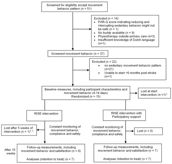 Therefore the objective of this study was to determine the preliminary effectiveness and feasibility of the RISE intervention to support community-dwelling people with stroke, who are highly sedentary, to reduce total sedentary time and interrupt sedentary time. Additionally, the added value of including participatory support within the RISE intervention was determined.