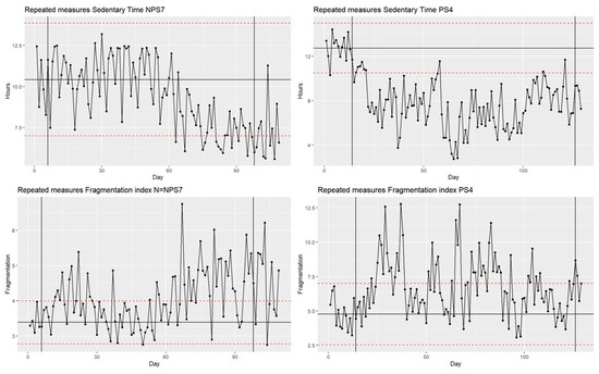 Examples of visualization of movement behavior. Note: PS: participatory support; NPS: group without participatory support. The black vertical lines indicate the start and stop of the intervention. The black horizontal line represents the mean from the baseline measurements. The red dashed horizontal lines indicate the two standard deviation bands from the baseline measurement. In total sedentary time, a downward trend indicates a reduction in sedentary time. An upwards trend in fragmentation indicates an increase in the interruption of sedentary time.