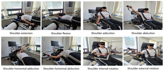 Muscle strength and endurance were measured using Humac NORM (CSMi, Stoughton, MA, USA), which quantifies muscle strength and endurance by setting the angular velocity and repetitions [36]. Shoulder flexion and extension, shoulder adduction and abduction, shoulder horizontal adduction and horizontal abduction, and shoulder internal and external rotations were measured, as shown in Figure 3. Prior to the measurement, all the participants stretched in a motion similar to the measurement position to prevent injury and warmed up on a seated cycle at low intensity [37]. Two angular velocities (60 and 180°/s) were used for each shoulder movement. Muscular strength and endurance were measured using the participants’ dominant arm. Strength was recorded by measuring five repetitions at 60°/s (previously practiced three repetitions), and endurance was recorded by measuring 15 repetitions at 180°/s (previously practiced five repetitions) [38]. The rest period between the strength and endurance measurements was at least 1 min. Additionally, the rest period between different movement measurements was at least 5 min to ensure that muscle fatigue did not affect the results [36,39]. The ICC for shoulder muscle strength and endurance test with Humac NORM is 0.72–0.94 [36].