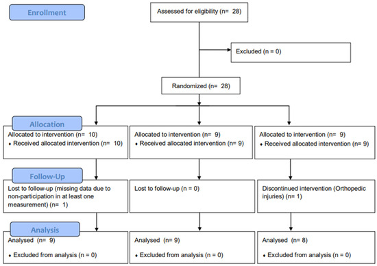 Data analyses were performed using SPSS software (version 26.0; IBM SPSS Inc., Armonk, NY, USA). First, the normality test was performed using the Shapiro–Wilk test. Means and standard deviations were also calculated, and a two-way analysis of variance was performed to determine changes over time and between groups. The Bonferroni test was used to confirm post hoc analysis, and the Hedges’ g calculation formula was used to determine the ES of the Pilates exercises between the groups. Muscle strength and endurance measured with Humac NORM were converted to Newton meters by multiplying the raw data by 1.356, with foot-pounds as the unit of output [40]. The significance level for all statistical analyses was established at 0.05 (p < 0.05). This manuscript adheres to the applicable CONSORT guidelines (Figure 4).