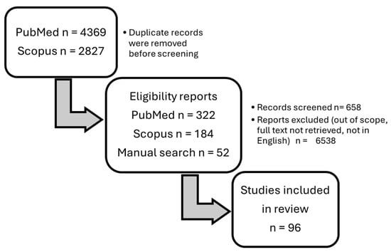 In total, 558 potentially eligible articles were detected. Additional relevant publications were obtained by reviewing the references from the chosen articles. After the removal of duplicates and irrelevant articles based on the titles, abstracts, and full-text articles, 658 records were screened, and 98 original articles were included in this review (Figure 1).