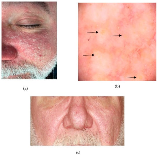 The case of the Birt–Hogg–Dubé syndrome: (a) clinical presentation of multiple fibrofolliculomas on the face; (b) videodermoscopy (Fotofinder Medicam HD 1000 Systems GmbH, Bad Birnbach, Germany) revealed small nodules composed of fibrosis (white opalescent colour) and acanthosis of the epithelium (yellow colour) at the level of hair openings or the infundibulum; at the top of some nodules a keratotic plug in the hair follicle opening was visible (arrow); (c) final aesthetic result of the procedure with Plasma IQ® (Berger & Kraft Medical, Ltd., Warsaw, Poland).
