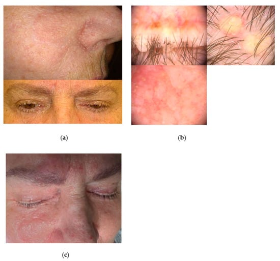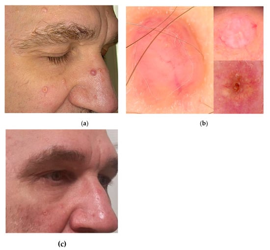 The case of Muir–Torre syndrome: (a) clinical presentation of the face with numerous small yellowish nodules with umbilical centres and larger pink nodules with visible telangiectasias on the surface; (b) the videodermoscopic examination enabled the differential diagnosis of the lesions—pink nodule with thin and large arborising vessels and yellowish blotches located peripherally, corresponding to larger sebaceous adenoma (on left), pink and white in colour nodule with visible withe strands, yellow micro-blotches, and irregular short vessels at the walls of the nodule corresponding to small sebaceous adenoma (upper right), yellow clods with crown vessels and central hair follicle opening—corresponding to the sebaceous hyperplasia (on lower right) (Fotofinder Medicam HD 1000 Systems GmbH, Bad Birnbach, Germany); (c) the aesthetic result two weeks after removal of the sebaceous adenoma of the nose and hyperplasia sebaceous of the forehead with plasma device.