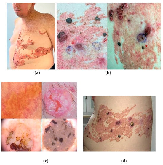 Nodular hyperkeratotic lesions were found within the forehead and scalp. Additionally, skull abnormalities were found, manifested by asymmetry and facial deformation. The patient underwent numerous surgical procedures (plastic and reconstructive) on the face and body with the aim of removing the bleeding lesions. In the previous histopathological analysis, one syringocystadenocarcinoma papilliferum in situ within a syringocystadenoma papilliferum lesion was diagnosed. The remaining lesions were benign. Frequent recurrences of bleeding after little traumatisation harmed the patient’s quality of life and daily functioning. Among the remarkable findings reported in his medical history, the patient underwent pericarditis and meningitis in the past, venous thrombosis of the left lower limb with subsequent pulmonary embolism, post-thrombotic syndrome, persistent swelling, and verrucous pyoderma. The patient suffered also from drug-resistant epilepsy. We performed videodermoscopic examination with mapping of all types of secondary skin tumours (Figure 4c), and, subsequently, 14 punch biopsy excisions were carried out of larger tumours with aim of ruling out syringocystadenocarcinoma. The histopathological examination confirmed syringocystadenoma papilliferum in 13 samples, though in 2 of them features of atypia were present, and disturbances in epithelial architecture were described. Smaller diameter lesions, dermoscopically correlating with syringocystadenoma papilliferum, were treated with plasma device under local anaesthesia, with good aesthetic results, and NRS 6/10 (Figure 4d). The patient remains under dermatological surveillance, requiring dermoscopic monitoring and occasional removal of suspicious or troublesome skin lesions.
