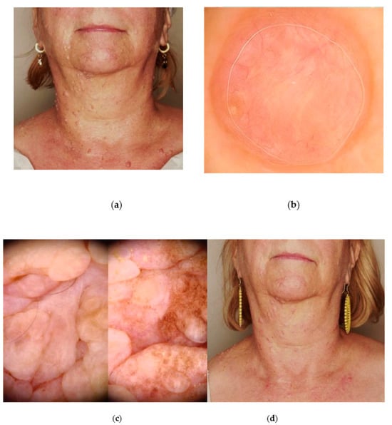 The case of neurofibromatosis type I. (a) Clinical presentation reveals multiple pink and skin-coloured soft nodules within the head, neck, and trunk area; (b) the videodermoscopy of solitary neurofibroma—pink structureless areas, white strands (scar-like areas), thin linear irregular vessels visible on the surface of nodule; (c) the videodermoscopy of plexiform neurofibroma—pink-white structureless areas with fissures corresponding to the flexural surface of the lesion, and peripherally visible brown pigmentation within homogeneous or fingerprint-like structures (Fotofinder Medicam HD 1000 Systems GmbH, Bad Birnbach, Germany); (d) the aesthetic result after single procedure with plasma device revealed presence of uneven skin surface, indicating the need for further correction.